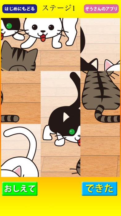 3x3のパネルに分割されたにゃんこの絵柄をフリックでパネルを入れ替えて 正しい絵柄にそろえるにゃんこのパズルゲームです。 正解がわからない場合は「おしえて」ボタンを押すと 完成イメージを見ることができますのでそれにあわせて並べて下さい。 「つづける」ボタンをおすとゲームにもどります。 完成したら、「できた」ボタンを押してください。 登場するにゃんこの絵柄は150種類あります。 ランダムに登場します。 ※※※※※※※※※※※※※※※※※※※※※※※※※※※※ 広告バナーが表示されますご了承ください。にゃんこスライドパズルのダウンロード